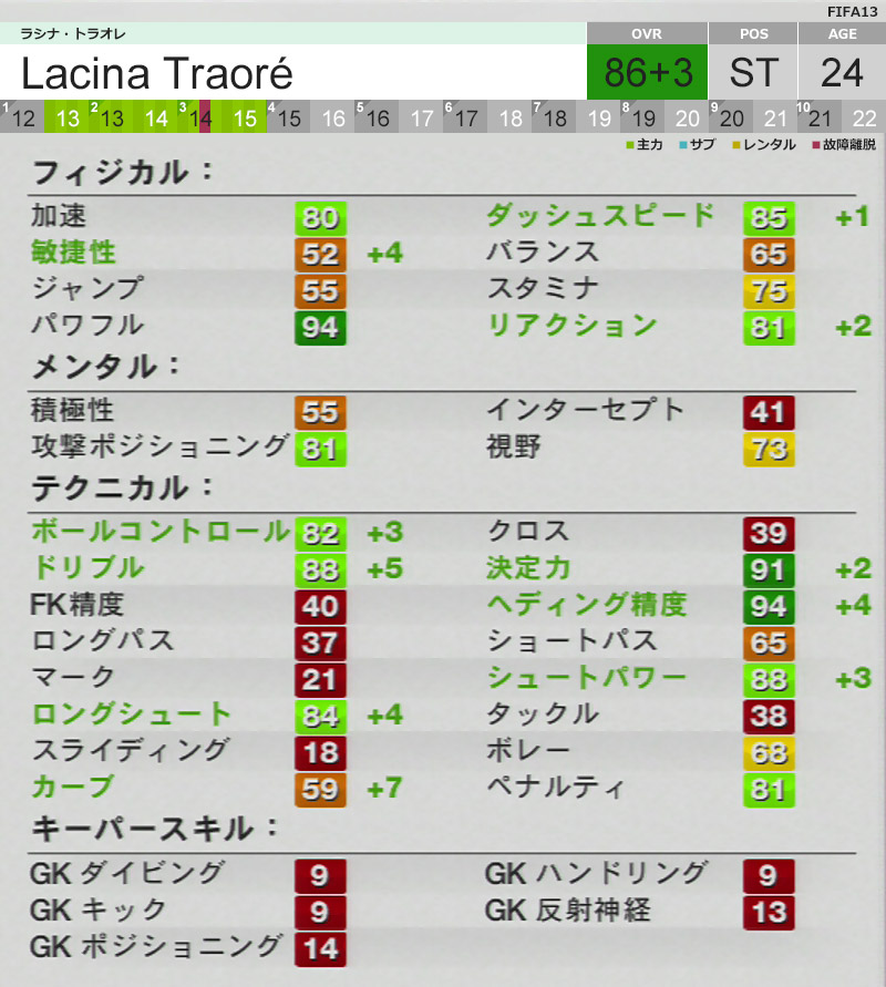 その他:身長203cm、実況あり(日本語版、だたしフルネーム呼びの場合アラン・トラオレ等の間違いあり)