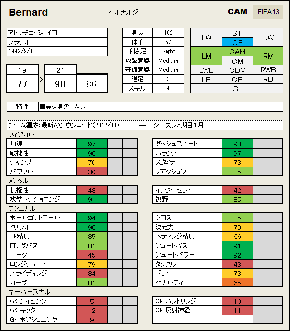 ポジションはRW、CF、CAMなどで使いましたが、やや攻撃的なポジションで相手を攪乱する役割をさせると生きる印象です。